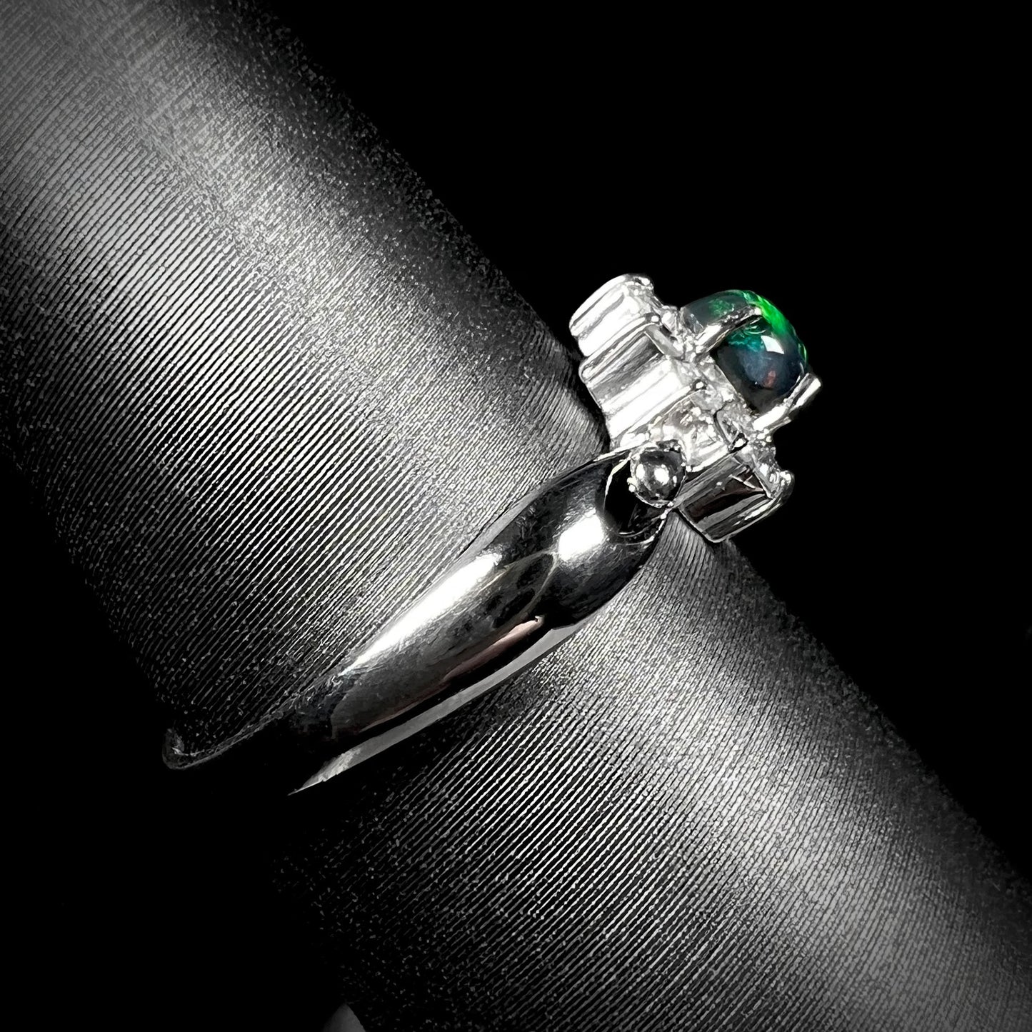 A striking burst of green color flashes out from this otherwise mysterious black opal, mounted in a platinum ring surrounded by ten sparkling diamonds. The opal itself is a rarity—an N1 body tone from Lightning Ridge, the darkest possible classification for black opal. Its vivid green flash appears only when viewed at just the right angle, like a secret waiting to be discovered.
