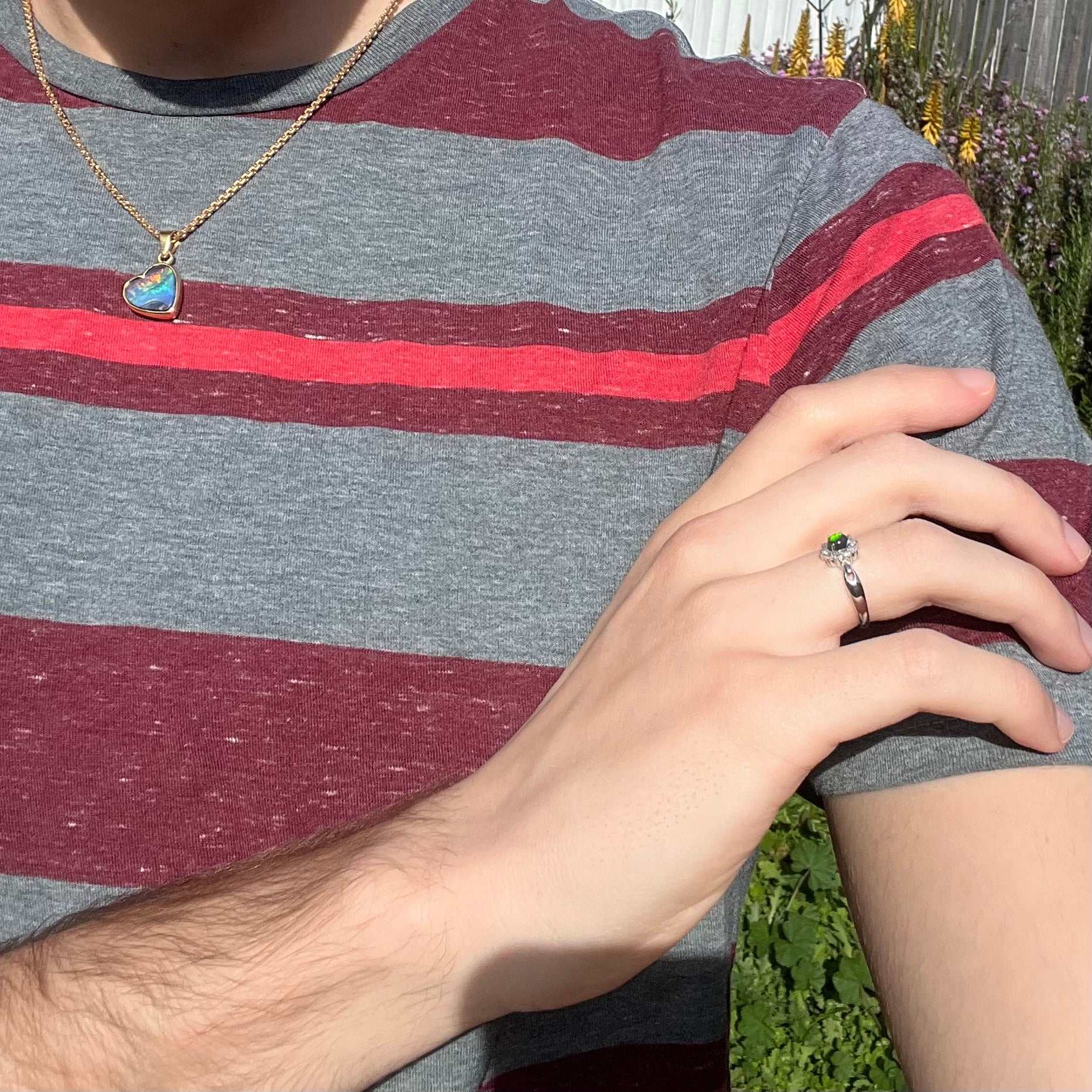 A Platinum Black Opal Engagement Ring with a Diamond Halo