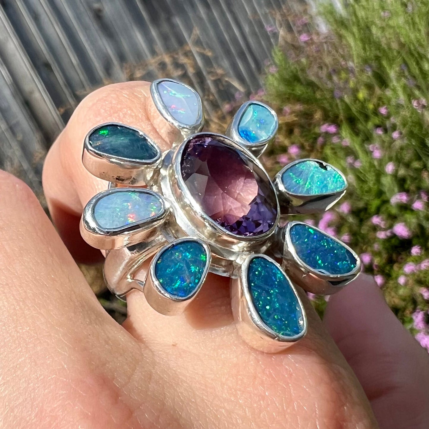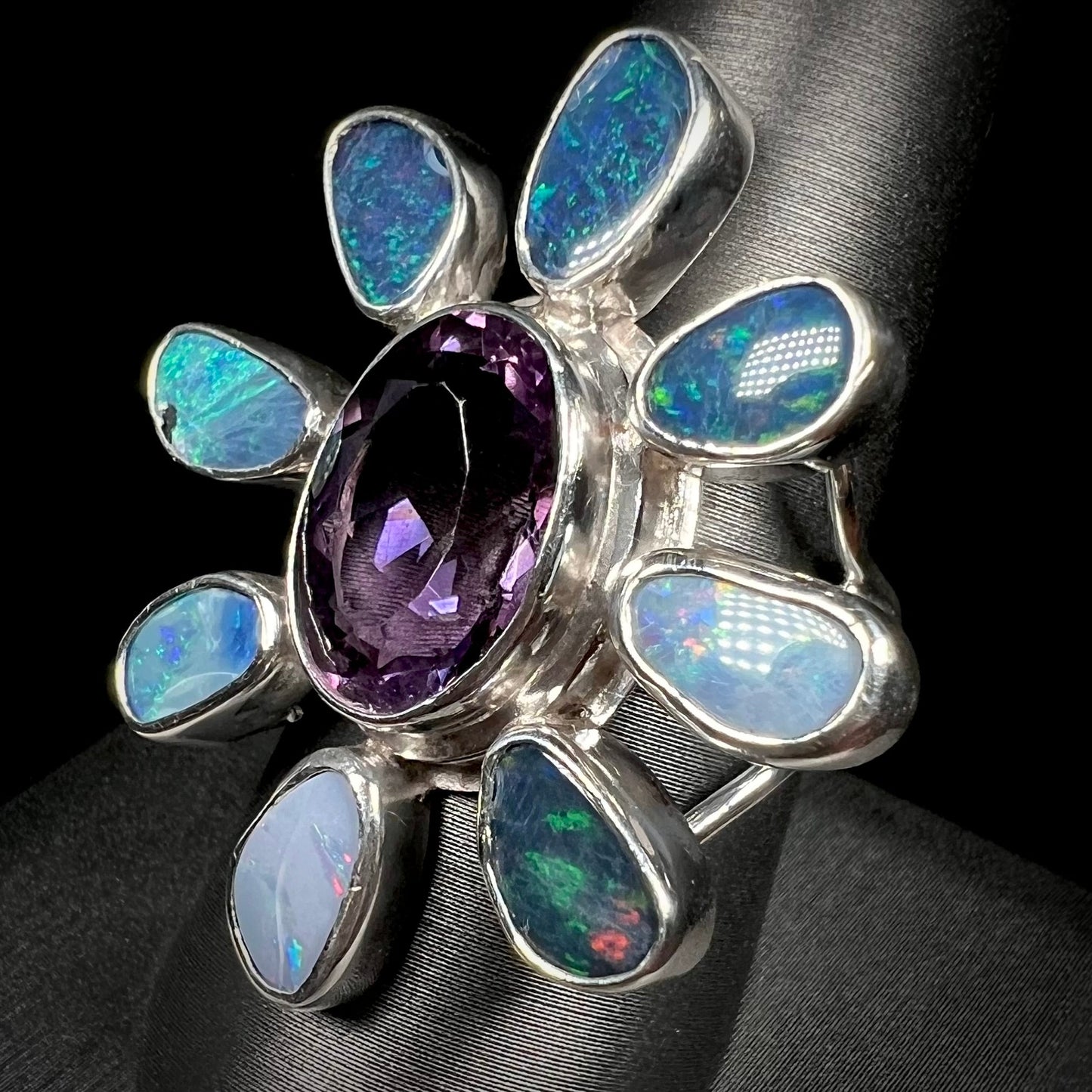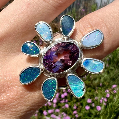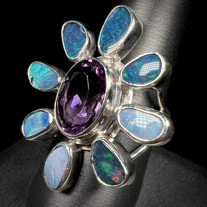 Handmade and one of a kind, this well-loved statement ring adds a maximalistic option to your wardrobe. Bezel-set in the center of the ring is an oval cut purple amethyst with a culet that rests on the wearer's finger; surrounding it are Australian black opal doublets that play gentle predominant flashes of red, blue, and green.