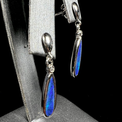 The rich blue body tone of these Austalian opal doublets pop in contrast to their sterling silver bezel mountings. Fixed to friction pushback posts, the opals dangle about three quarters of an inch from their connected silver studs.