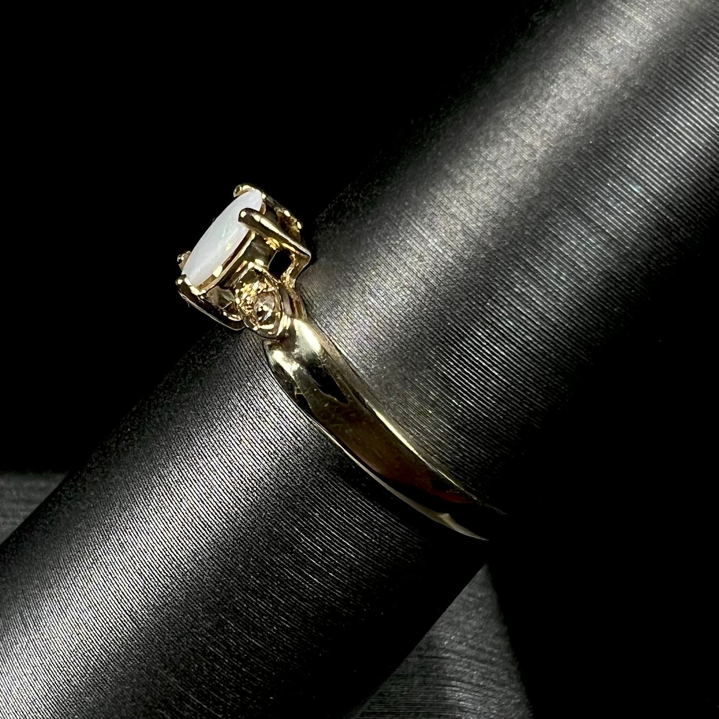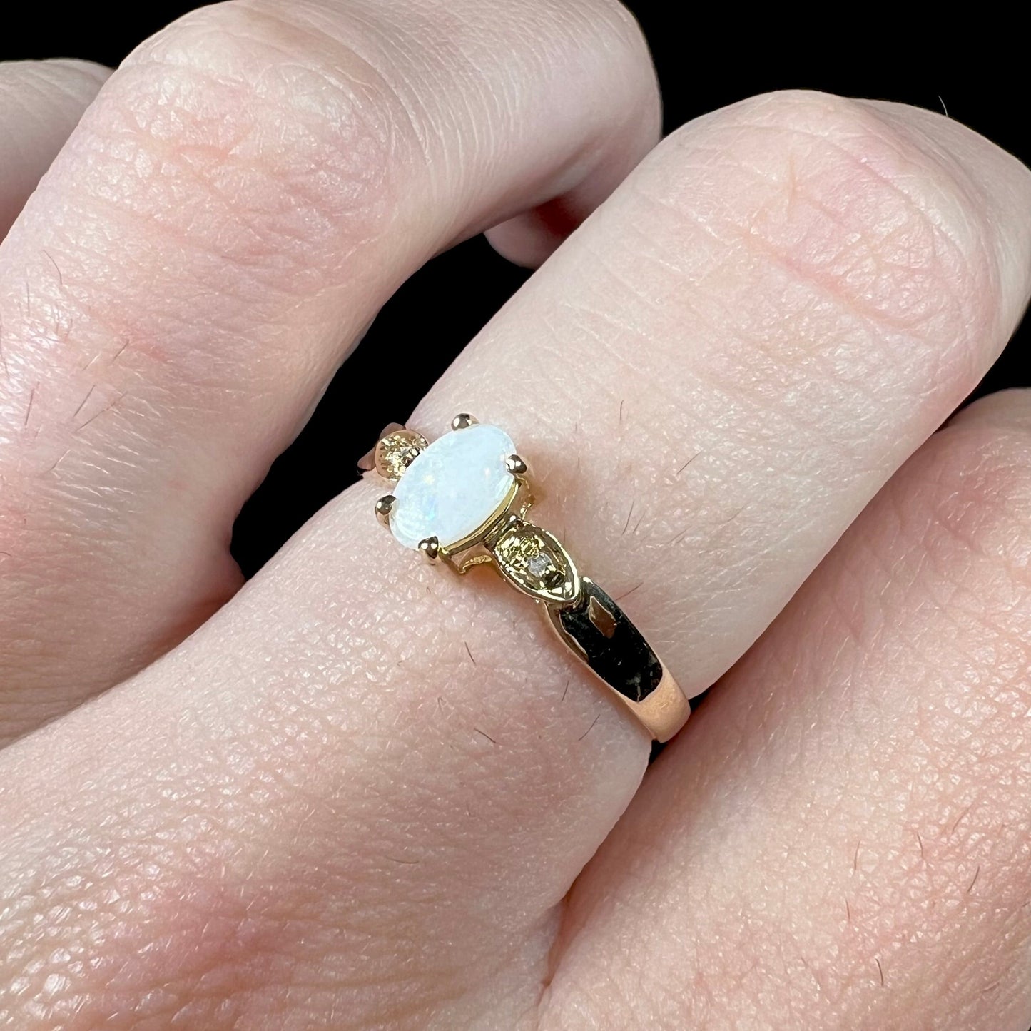 Reds, greens, and purples twinkle subtly across the surface of the natural Australian opal set in this yellow gold ring. Accenting the ring's clean design are two round cut diamond chips.